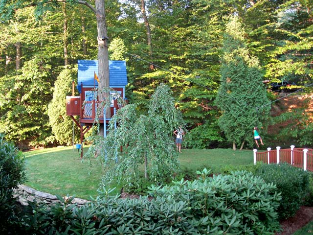 From this angle, you can just make out the flying kid on the zip line about 3/4 of the way across the yard.