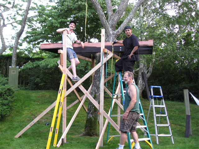 Barbara snapped this picture of her happy crew: Will, Marco and husband, Jeff (on the ground). The order of events for a treehouse is first the temporary bracing is erected, then the girder box is slid around the tree and bolted together, then the large 11' long deck is added above and bolted to the girder box. After this, knee braces will be added so the guys can walk on the deck. |