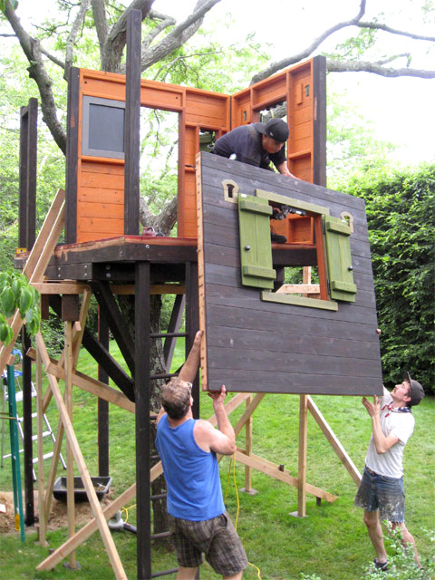 The beauty of modular building allows the guys to lift completed walls into place. Even the interior chalkboard was added before installation began.