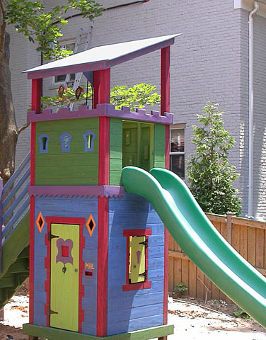 This Hideaway Fort sports an optional Shed Roof to provide shade in this sunny site. Another variation on the basic Hideaway is the Ship's Ladder on the left. The Ship's Ladder is an upgrade from the standard Rope Net Ladder, which makes the upper level more easily accessible. |
