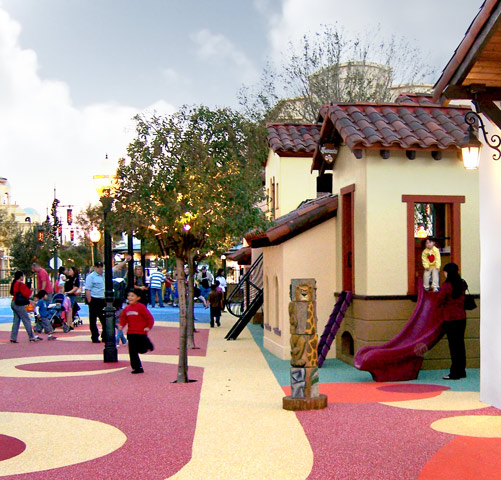 This view from this end of the playground shows the Bakery/Cafe Playhouse, which is designed for the 2 to 5 year olds. The Bakery/Cafe is actually 2 playhouses attached side-by-side at right angles to each other. The Bakery (seen here) has a hand-woven rope net ladder as the way up and an open scoop slide as the way down. |