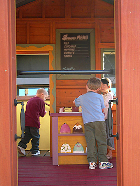 Inside the Bakery are all kinds of sweet things that kids can't resist. The menu is posted on the blackboard and the goodies are displayed on the built-in shelf: irresistible cakes to delight the eyes. Kids can touch and admire, but since everything is made of redwood (and fastened to the shelf) they can't really be eaten. |