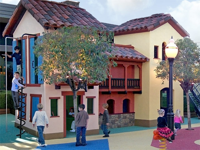 Romeo & Juliet's Stucco Playhouses are designed for the 5 to 12 year old age range. Romeo's 2-story playhouse (on the left) and Juliet's 2-story Playhouse (on the right) are connected by an upper & lower "Breezeway Bridge" with faux stone facing and balcony. Both the Playhouses and the Breezeway Bridge have authentic Spanish tiled roofs.