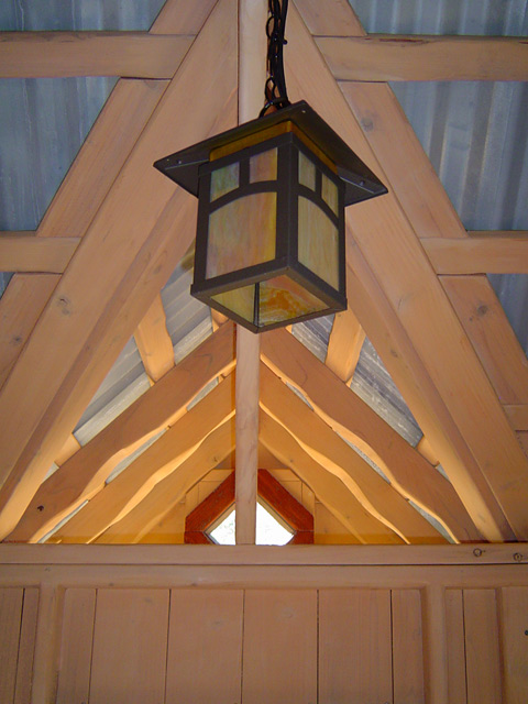 Beautiful details give the Tree Top Inn its unique and cozy feel. The Gable roof has hand-carved ceiling rafters and beams. It is illuminated by day with natural light from the diamond shaped opening on each gable end and illuminated by night with soft light from the artistic lantern hanging from the mid beam. |
