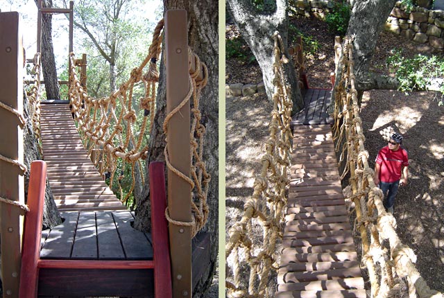 From either direction, you can run along the Swinging Bridge feeling the swing and sway whether you are coming or going. We particularly love the Entrance Deck built around the split tree trunk. It is truly a grand entrance that lets you climb up a rung ladder, pass between two massive tree limbs and then journey up a long Swinging Bridge with hand-woven rope railings. |