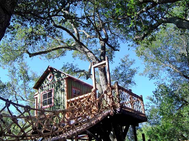 Have secret meetings in your Tree Top Clubhouse with its unusual corrugated tin roof and rustic glass laminated doors and windows. Spend hours playing games, sharing secrets or reading a great book while birds serenade you in your clubhouse haven. Or hangout on the big deck where the tree breaks through the deck flooring and provides a wonderful leafy canopy overhead. |
